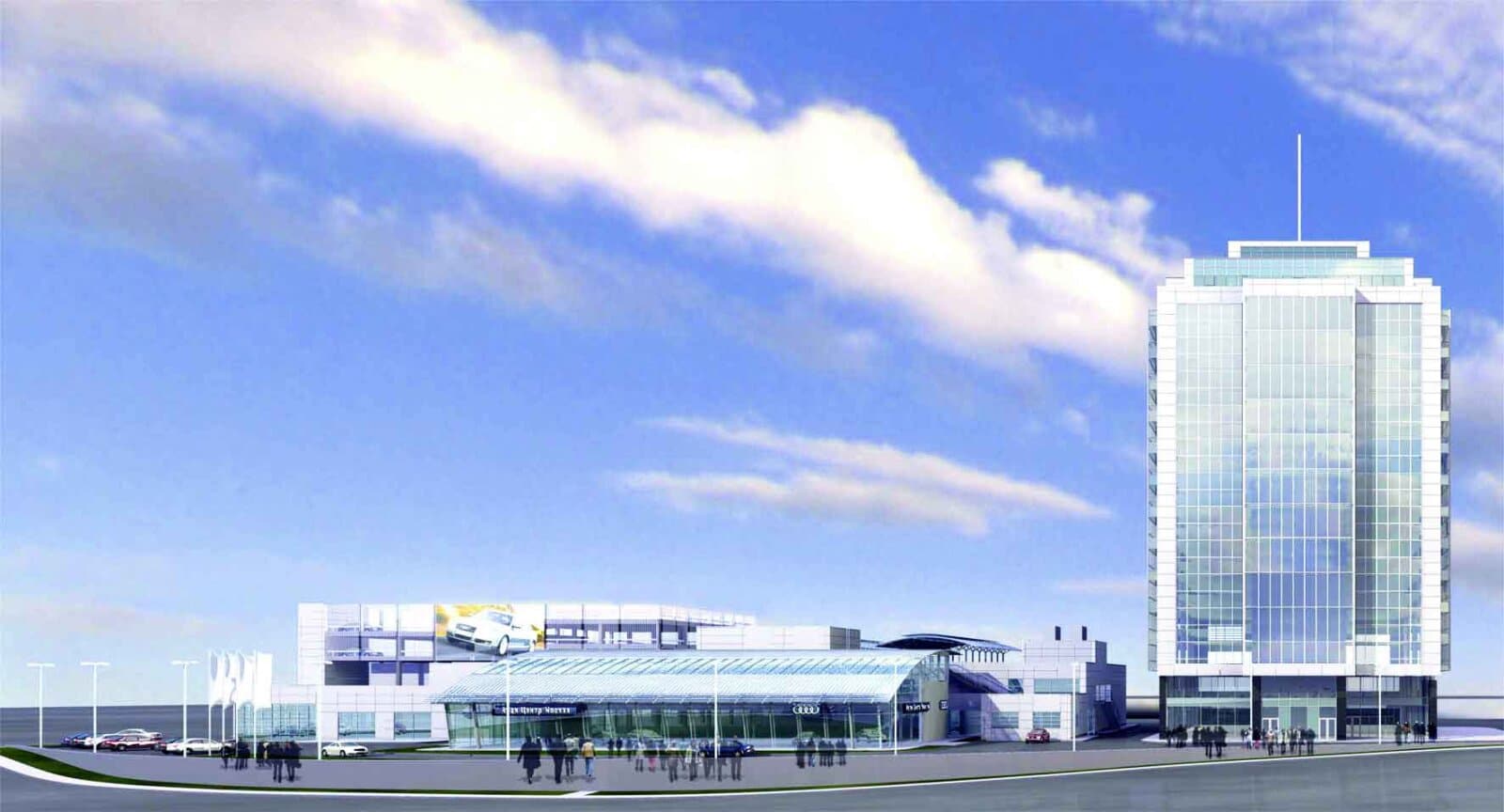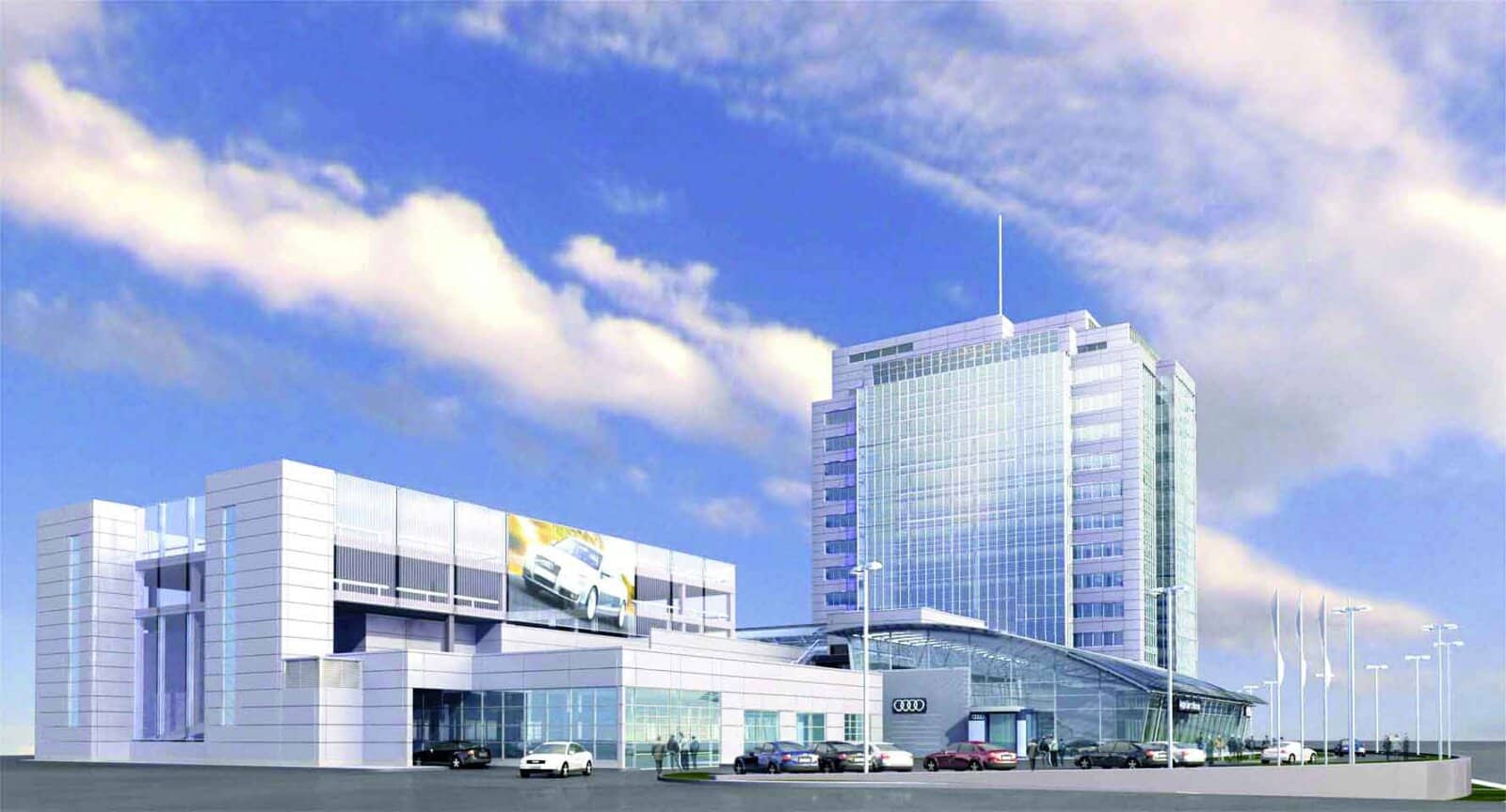 В состав работ комании «ЭНКА» по проекту входит строительство представительства автомобильной компании «Ауди», в здании которой устроены двухуровневая парковка и пятиэтажный демонстрационный зал. Башня административного здания включает в себя два подземных этажа для парковки автомобилей и пятнадцать этажей офисных помещений. Работы по договору включали строительно-монтажные работы по строительству высотного здания «под отделку». Общая площадь застройки по проекту составила 41 440 м², на 11 000 м² из которых расположено представительство центра Ауди, на 9,000 м² — этажи подземной парковки автомобилей.