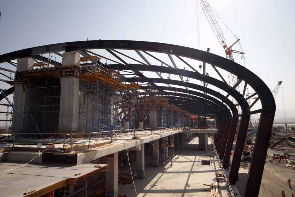 • Металлическая конструкция здания аэровокзального комплекса включает чрезвычайно тяжелые изогнутые фермы Первой проблемой явилось производство так как изготовление таких необычных компонентов само по себе уже представляет трудности. Изготовление было успешно выполнено компанией «Чимташ». Трудности также возникли при транспортировке: из-за ограниченных размеров и компонентов, изготавливаемых цельными на мощностях «Чимташ», поставляемых в разобранном виде на участок с последующим свариванием для создания цельной фермы, готовой к установке на место. Так как вес ферм был существенным применялось два гусеничных крана грузоподъемностью 1 600 тонн. Монтажные работы были выполнены с соблюдением мер безопасности не смотря на возникшие проблемы из-за действующего транспортного пути рядом с площадкой и взаимодействия.