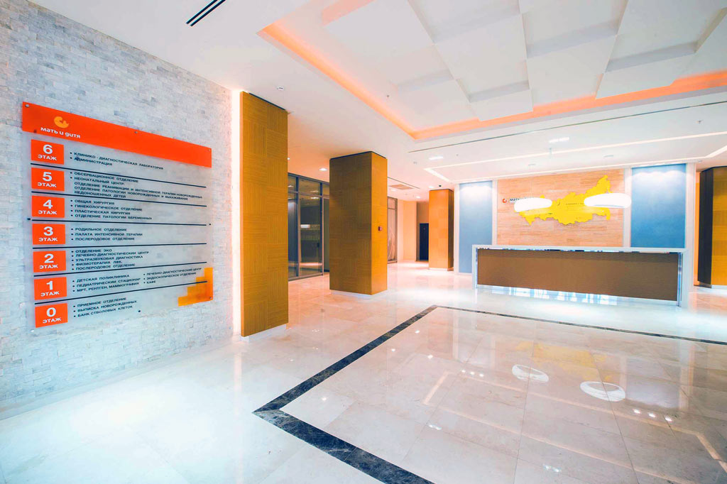 По аналогии с ранее спроектированным и построенным для другой организации центром комплекс строительных работ включал для Перинатального медицинского центра в г. Уфа включал все общестроительные работы и возведение конструкций, устройство фасадной части, все отделочные работы, интерьерное декорирование основных холлов и SPA-зон, механические и электрические инженерные системы, систему подачи медицинского газа, все системы слабого тока, включая систему видеонаблюдения, систему безопасности и контроля доступа, вызова медицинского персонала, систему оповещения, пожарной сигнализации, систем контроля и управления зданием, малые архитектурные формы и оформление прилегающей территории.
