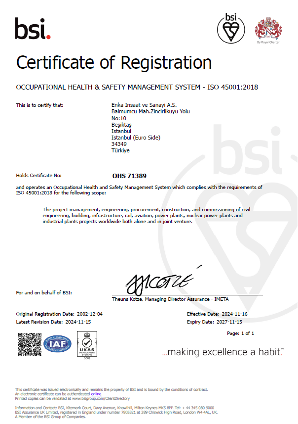 Our H&S Management System is in full compliance with ISO 45001 Health and Safety Management Systems Standard. Our certificate which we received in 2002 for the first time, has been approved and renewed every year through regular audits by British Standards Institute (BSI).