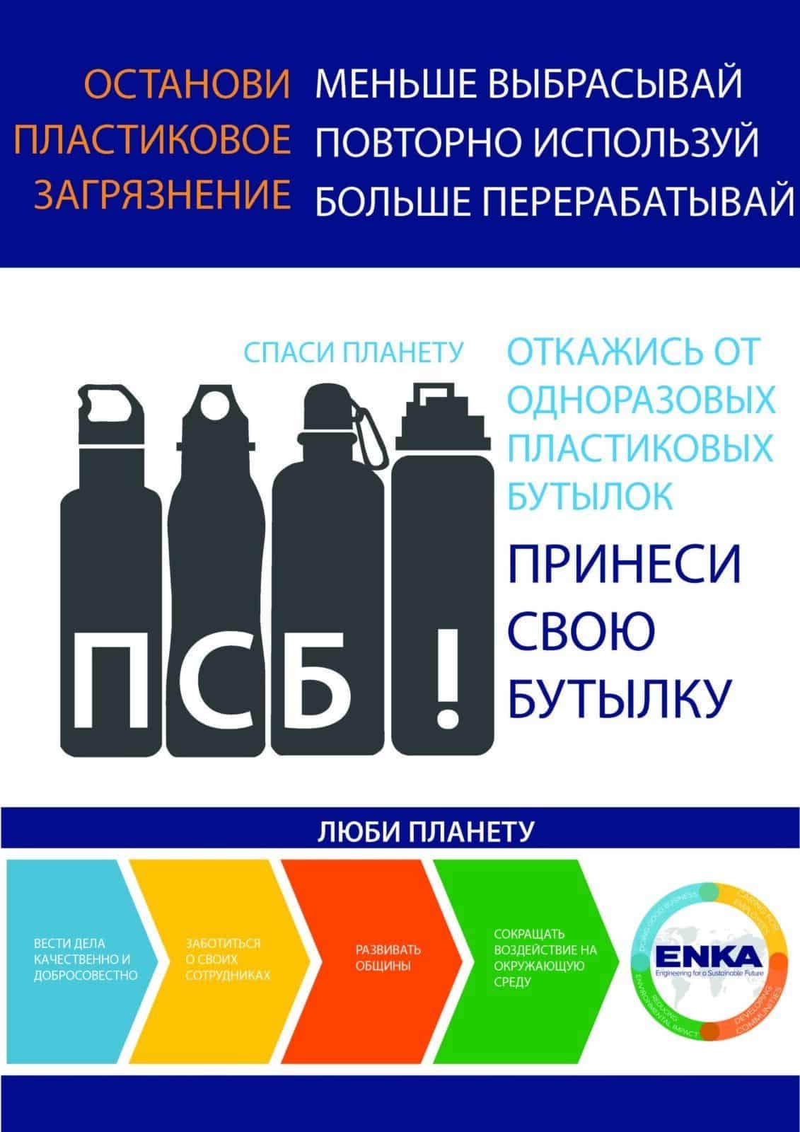 Для того чтобы поднять осведомленность в этом отношении и в соответствии с политикой устойчивого развития компании, группа компаний «ЭНКА» решила прекратить закупку пластиковых бутылок с водой.