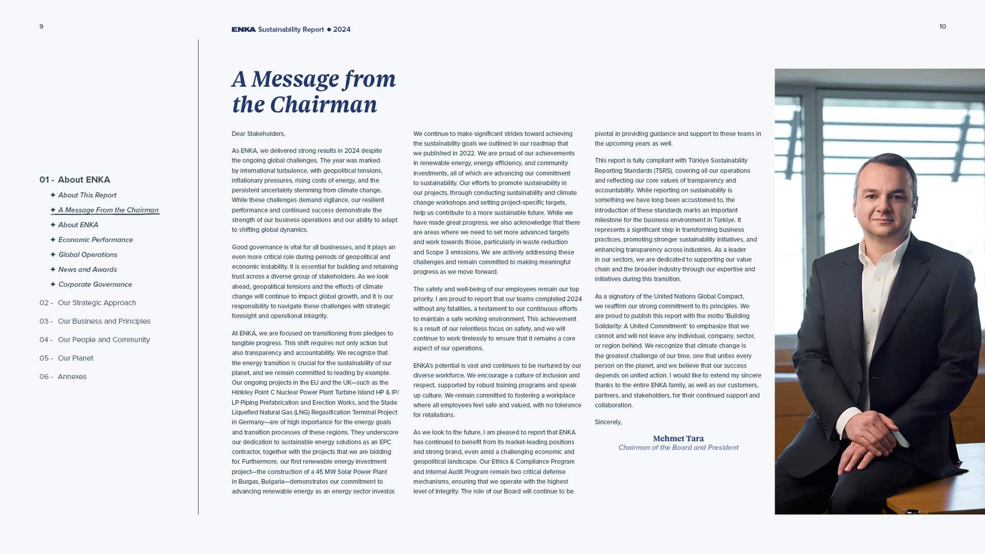 As ENKA, we delivered strong results in 2024 despite the ongoing global challenges. The year was marked by international turbulence, with geopolitical tensions, inflationary pressures, rising costs of energy, and the persistent uncertainty stemming from climate change. While these challenges demand vigilance, our resilient performance and continued success demonstrate the strength of our business operations and our ability to adapt to shifting global dynamics….