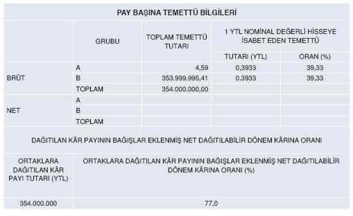 16.04.2008 tarihinde saat 15:00’de yapılan 2007 yılı Olağan Genel Kurul toplantısında, 2007 dağıtılabilir dönem karı üzerinden hissedarlarımıza; 1 (bir) TL’lik nominal değerli hisse senedi başına 0,060 TL brüt / 0,051 TL net (çıkarılmış sermaye üzerinden brüt %6,0, net %5,1 olmak üzere) toplam 54.000.000.- TL nakit temettü ile 300.000.000.- TL bedelsiz sermaye artışı (%33,33 oranında) yapılmasına karar verildi.