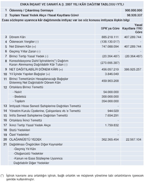 16.04.2008 tarihinde yapılan 2007 yılı Olağan Genel Kurul Toplantısı kararları dikkate alınarak, ENKA İnşaat ve Sanayi Anonim Şirketi’nin sermayesinin 900.000.000.- (Dokuzyüzmilyon Yeni Türk Lirası)’ndan 1.200.000.000.- (Birmilyar ikiyüzmilyon Yeni Türk Lirası)’na çıkarılmasına, artırılacak 300.000.000.-(Üçyüzmilyon Yeni Türk Lirası)’nın, tamamının Genel Kurul Kararı gereğince dağıtılmasına karar verilen 1.nci temettünün sermayeye ilave edilecek kısmından karşılanmasına ve kayda alınma belgesi alınması için Sermaye Piyasası Kurulu’na müracaat edilmesine oybirliğiyle karar verilmiştir.